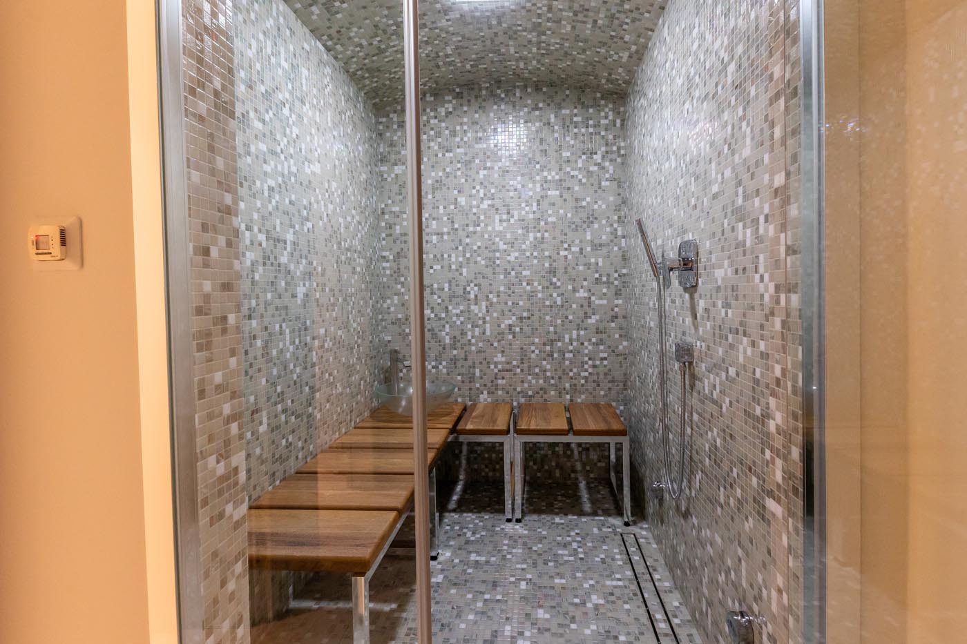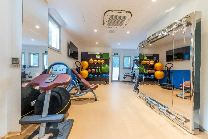 Full fitness studio, steam room, and massage suite