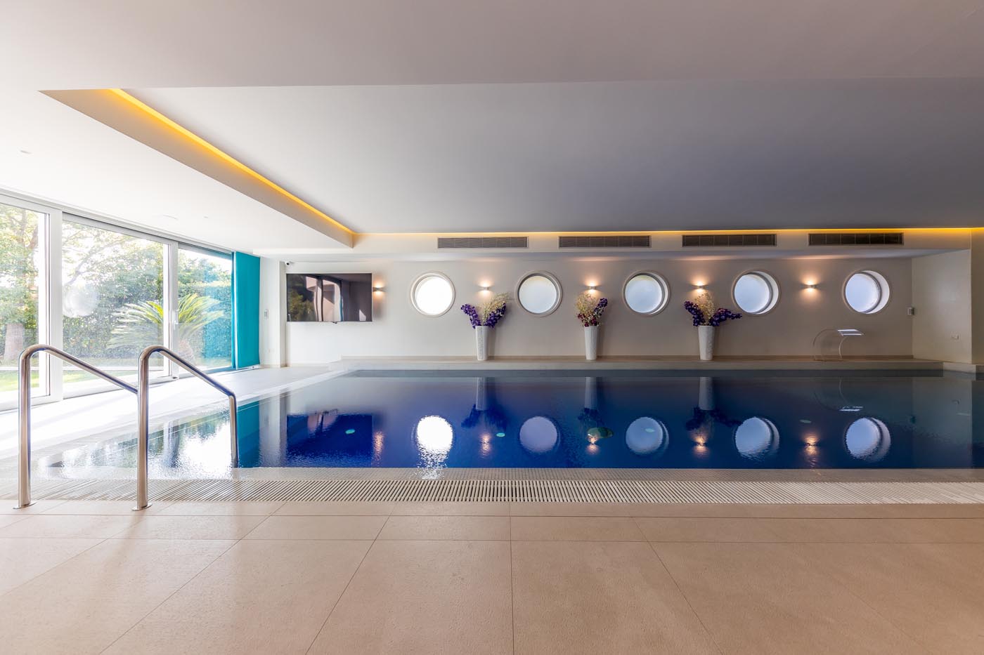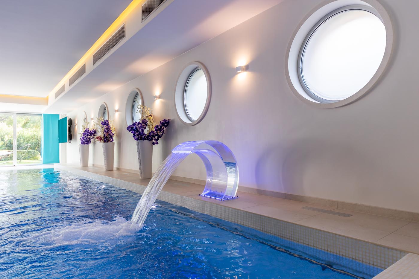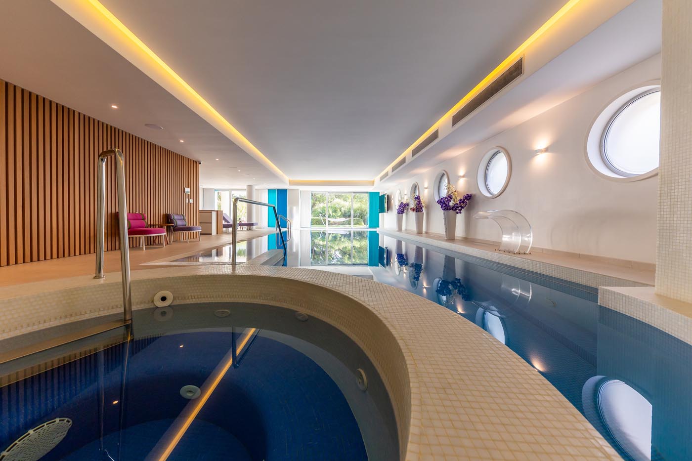 A 64 m² indoor pool with whirlpool, opening to a tranquil garden